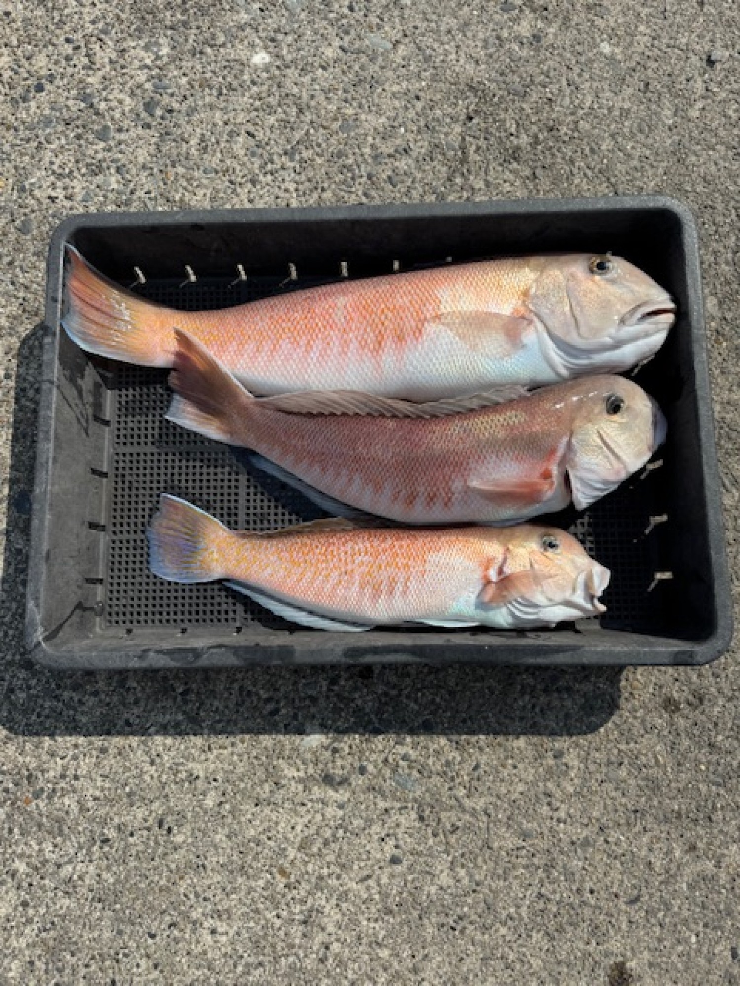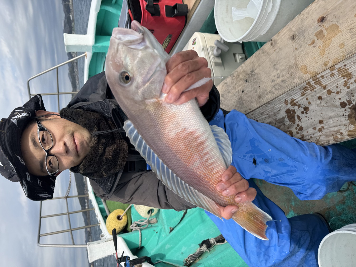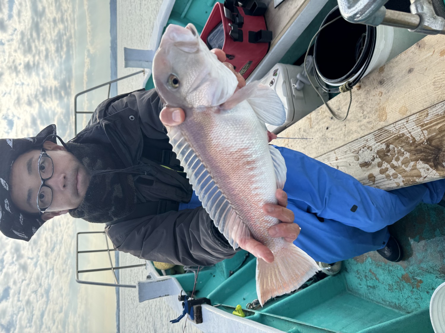 シロアマダイ五目、本日は1名様です。52cm、 42cm、 40cm、3尾でした。特大出ましたよ。外道の当たり少なくサバフグ1匹だけでした。